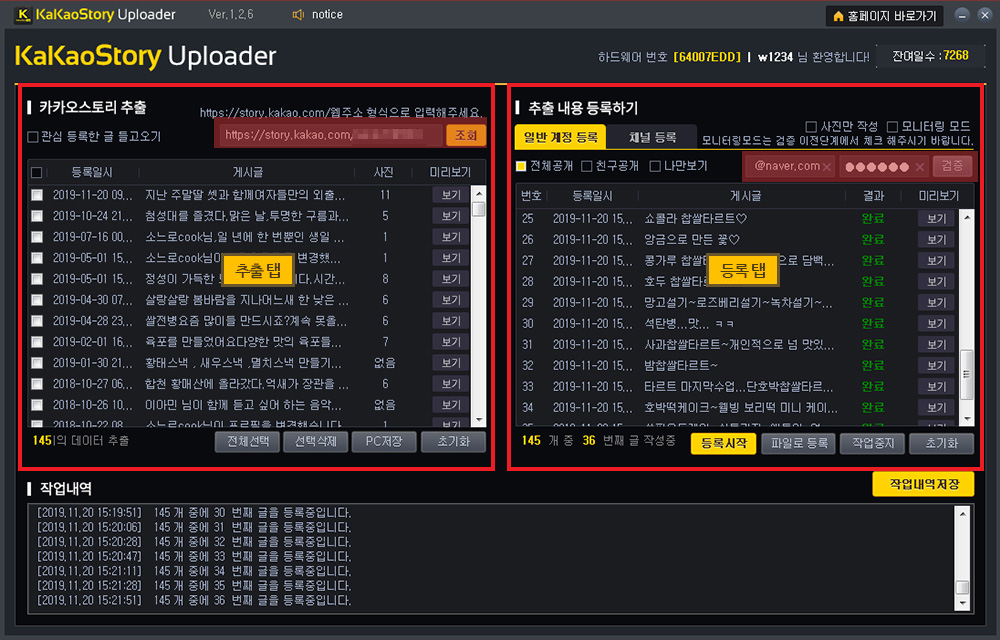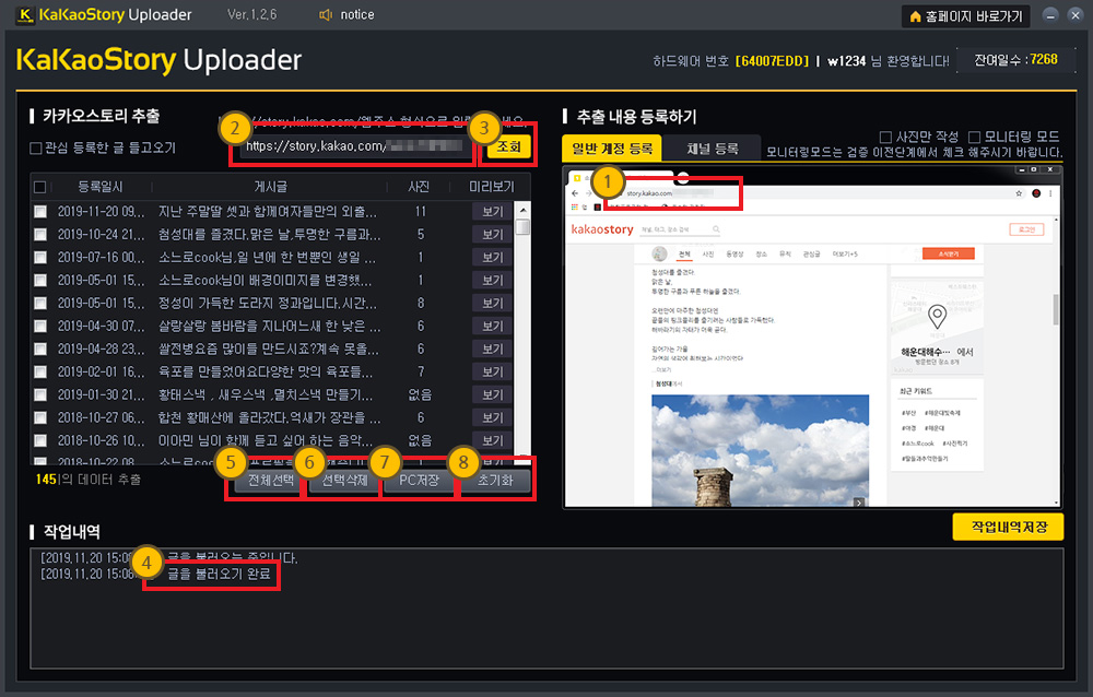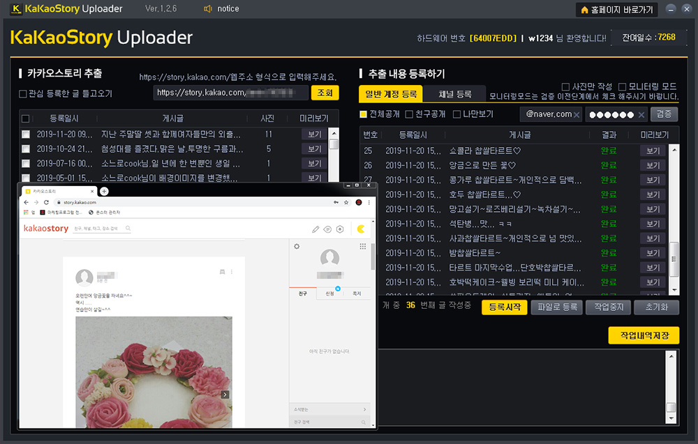 카카오스토리 추출 탭의 리스트에 게시글 목록이 모두 들어왔다면, 다시 작성하실 계정을 입력하고