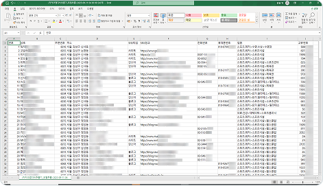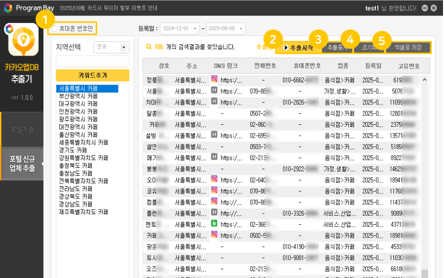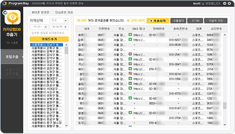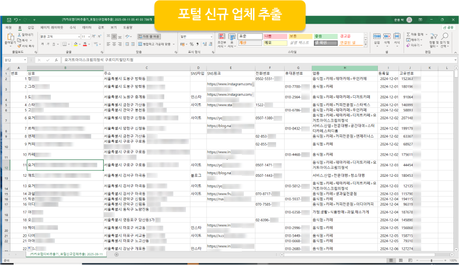 카카오맵에 등록된 업체들의 휴대폰번호, SNS링크, 주소 등의 디비가 추출됩니다.