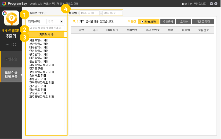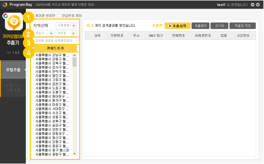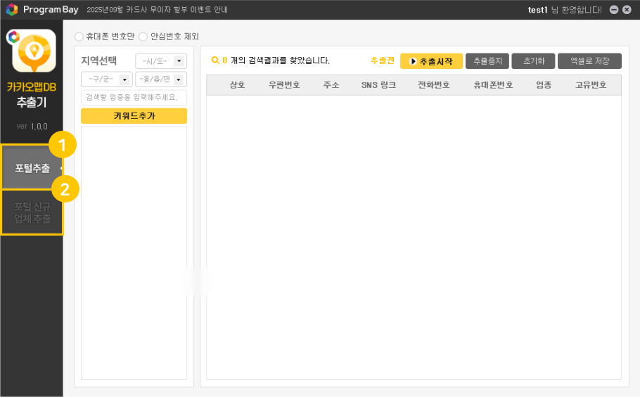 1포털추출 : 추출시작 버튼 클릭 시점으로 실시간 카카오맵에 등록된 DB를 추출합니다.
