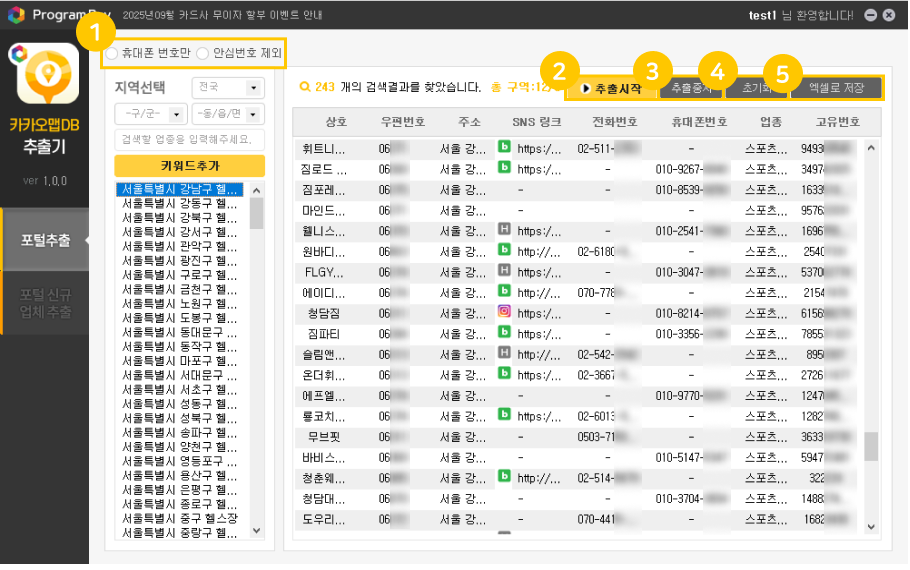 안심번호 제외: 안심번호로 등록된 업체를 제외하고 DB를 추출할 수 있습니다.
