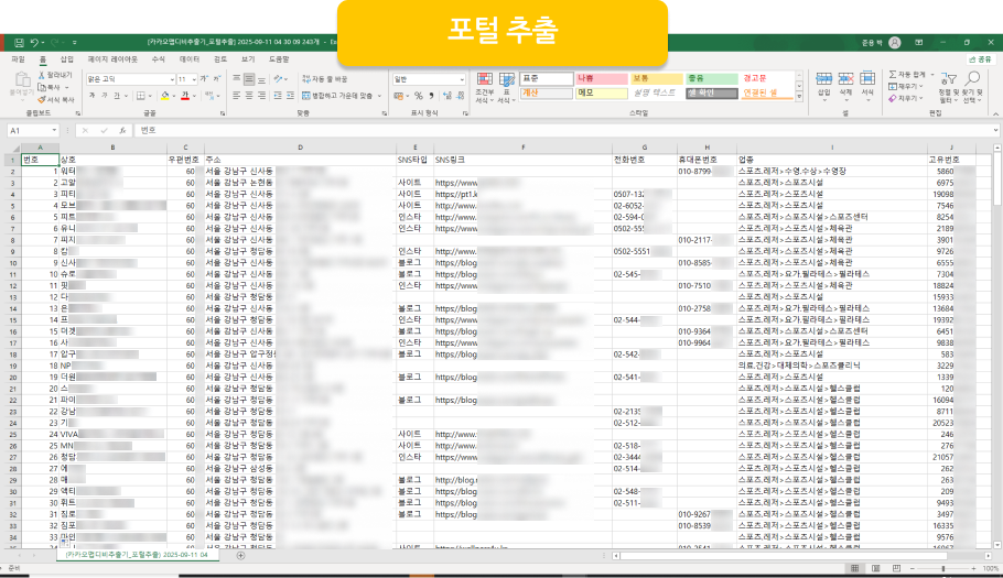 : 상호 / 주소 / SNS타입 / SNS링크 / 전화번호 / 휴대폰 번호 / 업종 / 등록일 / 고유번호