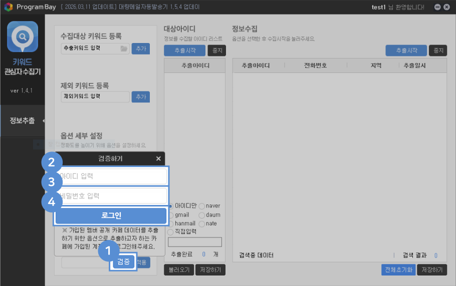 이 프로그램은 특정 키워드 콘텐츠에 반응한 사람들과 카페 회원 정보를 아이디, 이메일, 연락처 단위로 정리해주니 타겟 마케팅이 수월해졌어요. 무작위 영업보다 훨씬 덜 소모적이라 계속 활용하고 있습니다. |