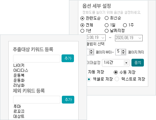 추출 제외키워드 등록 부터 여러가지 세부 옵션으로 원하느 정보만 추출이 가능합니다.